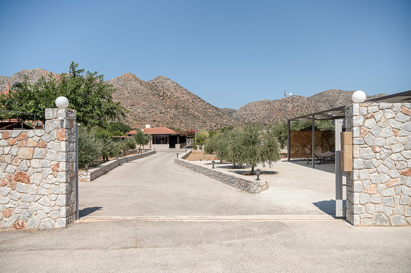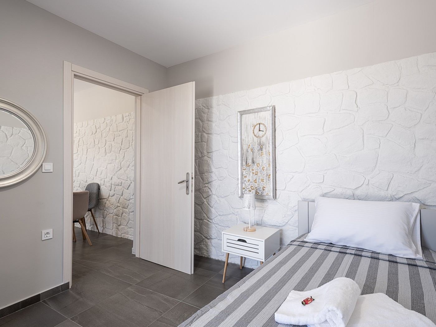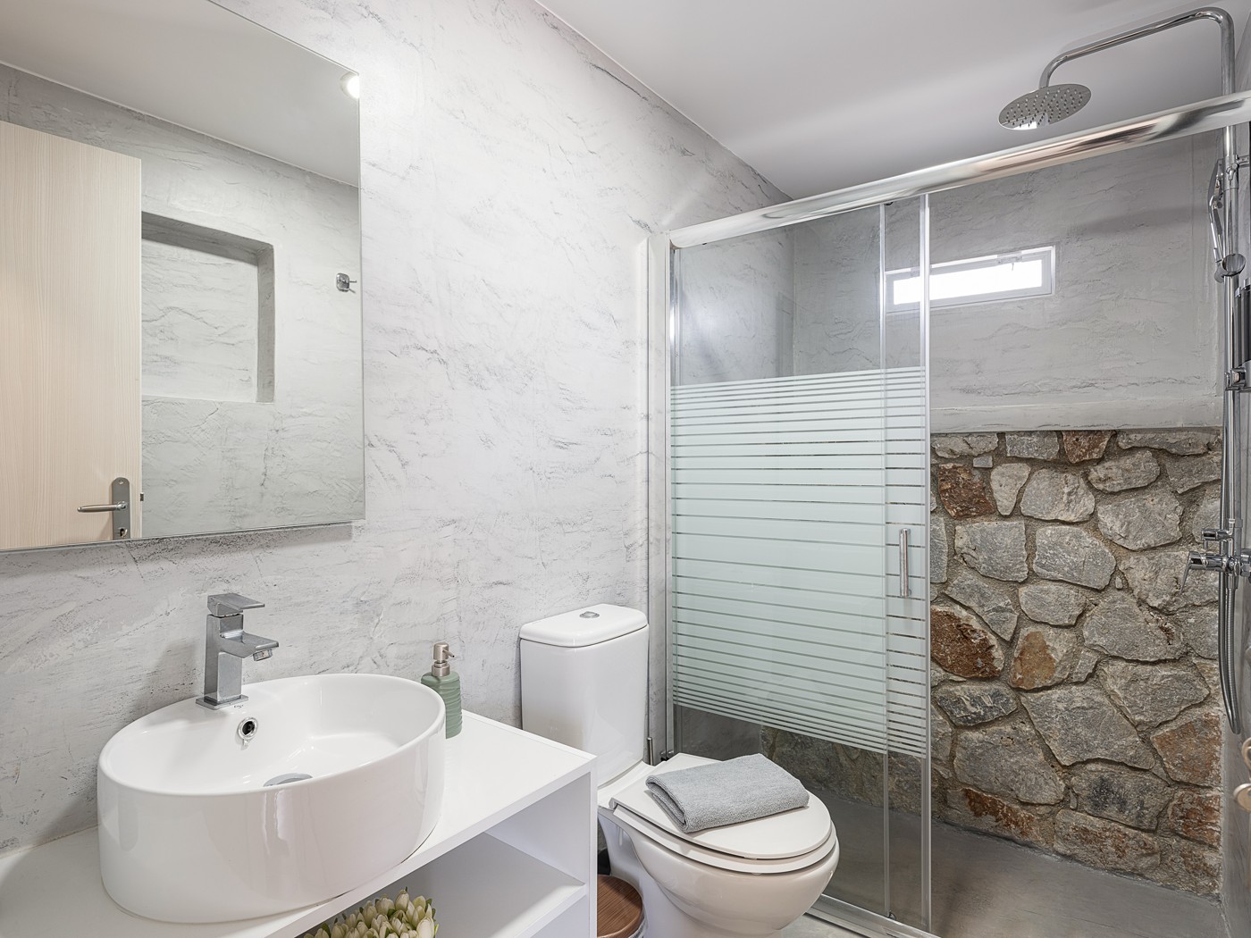The bathroom holds a shower place adorned with rocks excavated from the region of Stavros, connecting the property and its guests deeper with the surrounding area. On the outside, a large open terrace awaits patiently for the guests to enjoy some of the most starry summer nights, at the companionship of a glass of wine.