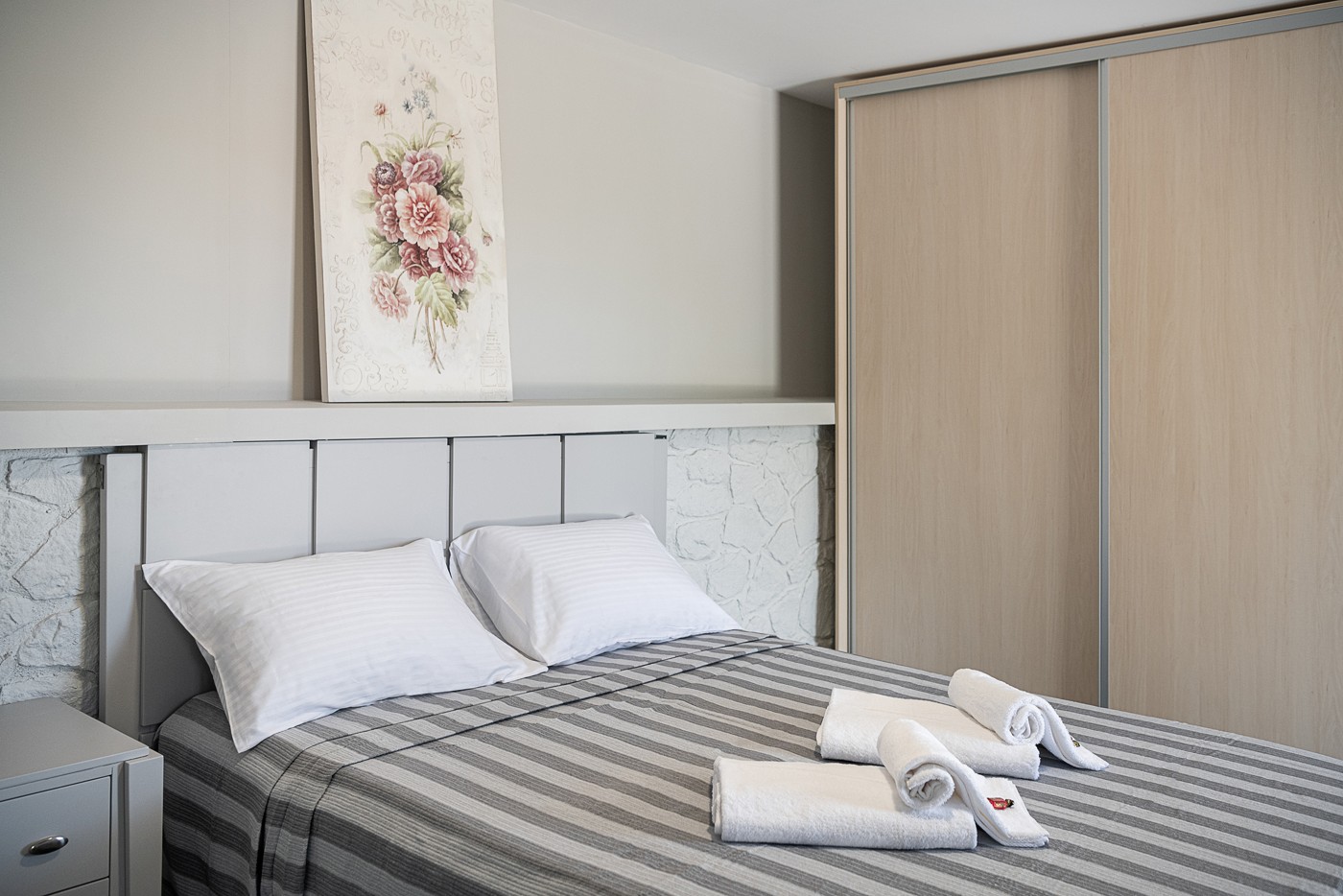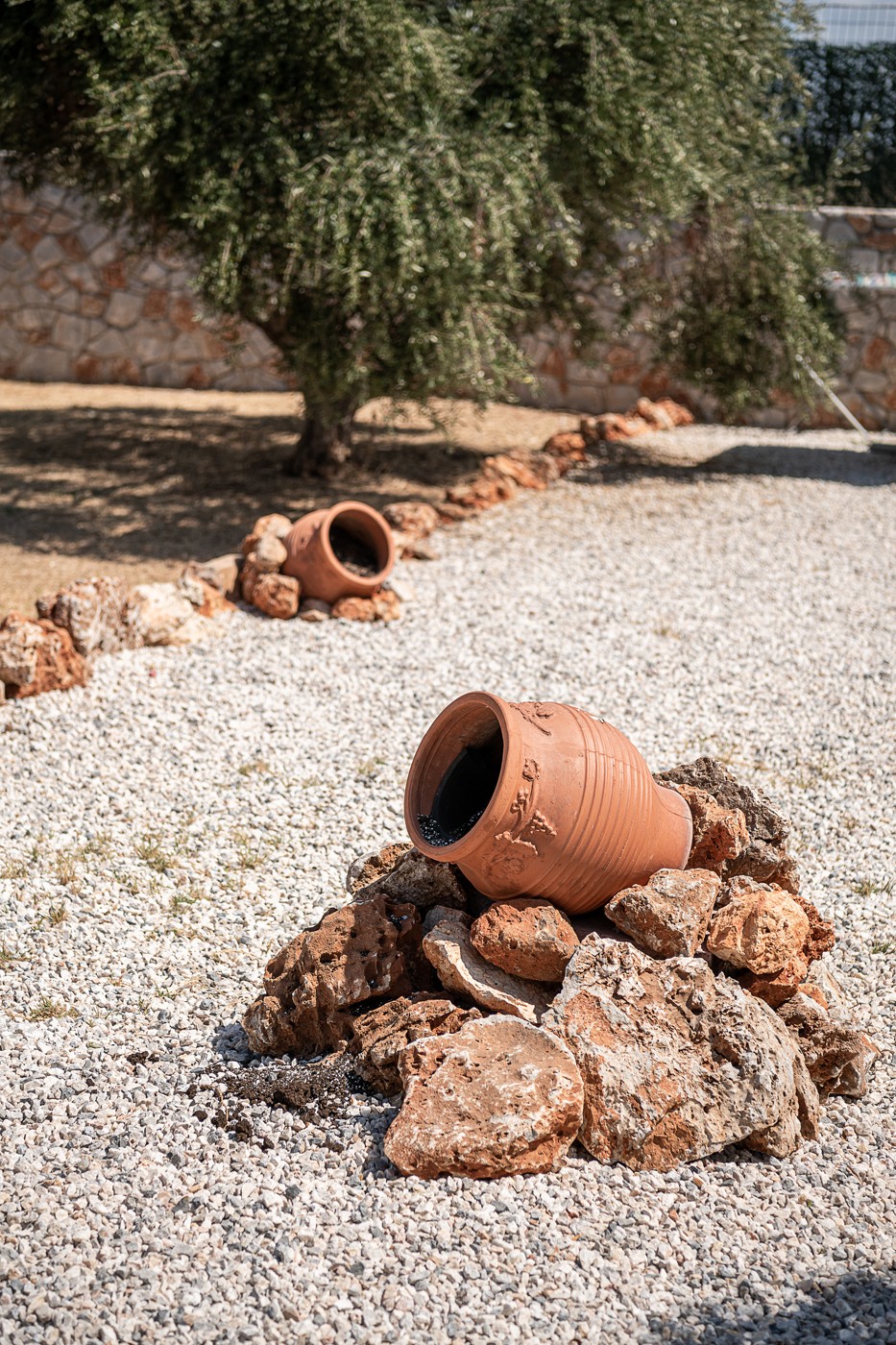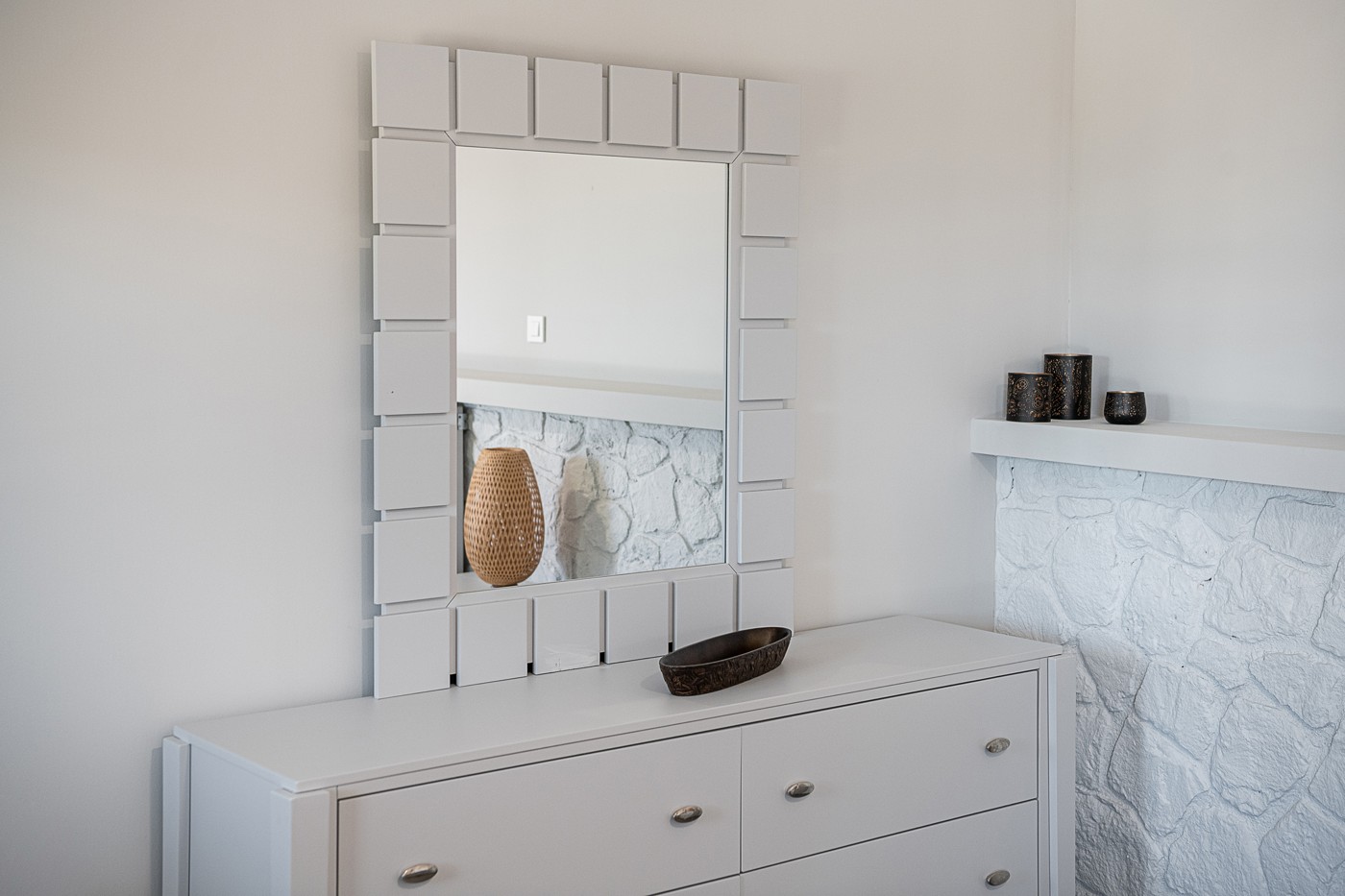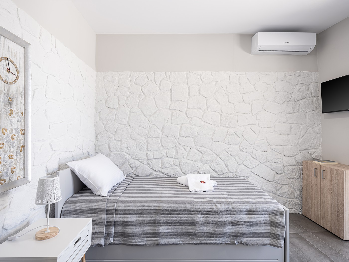 The bathroom holds a shower place adorned with rocks excavated from the region of Stavros, connecting the property and its guests deeper with the surrounding area. On the outside, a large open terrace awaits patiently for the guests to enjoy some of the most starry summer nights, at the companionship of a glass of wine.