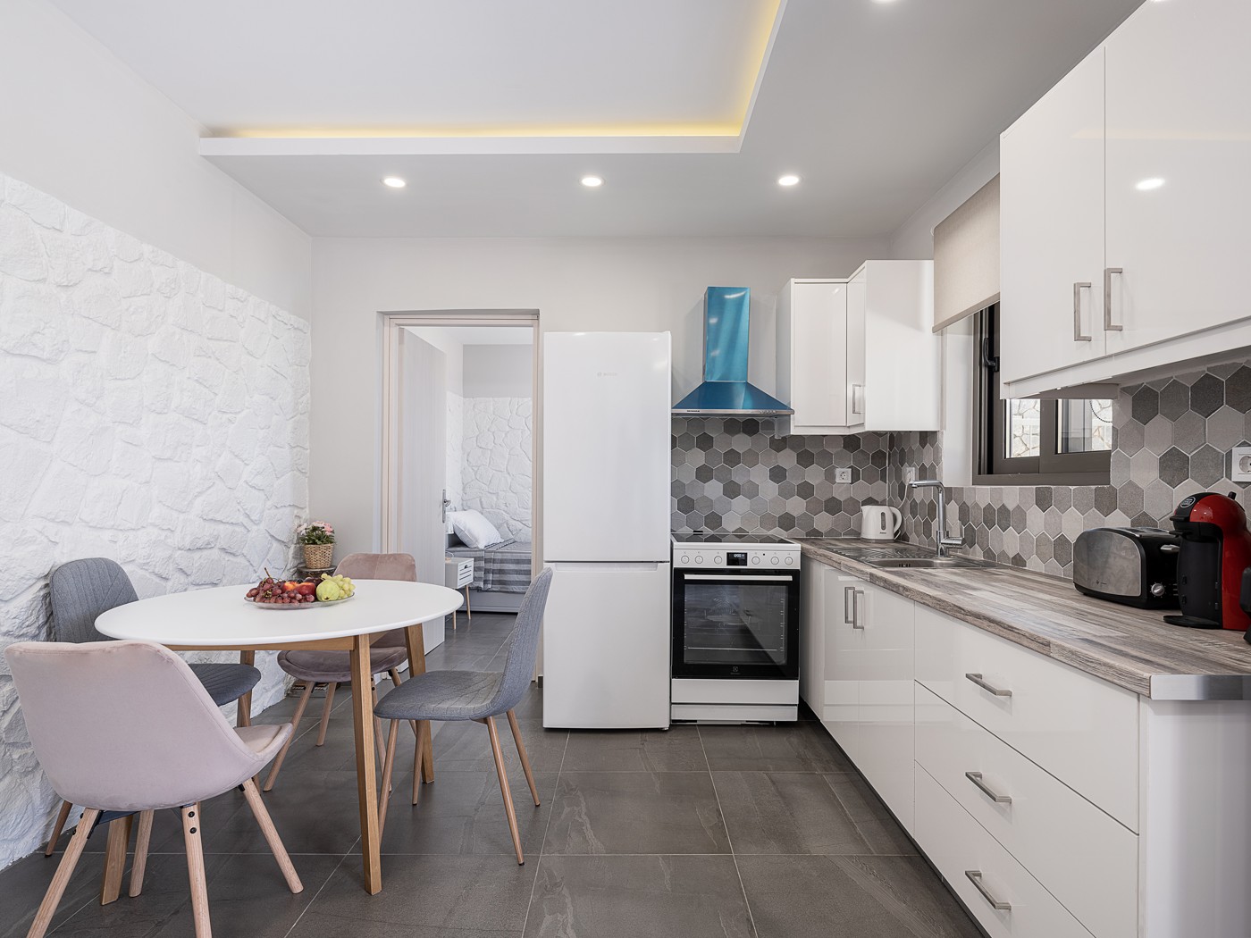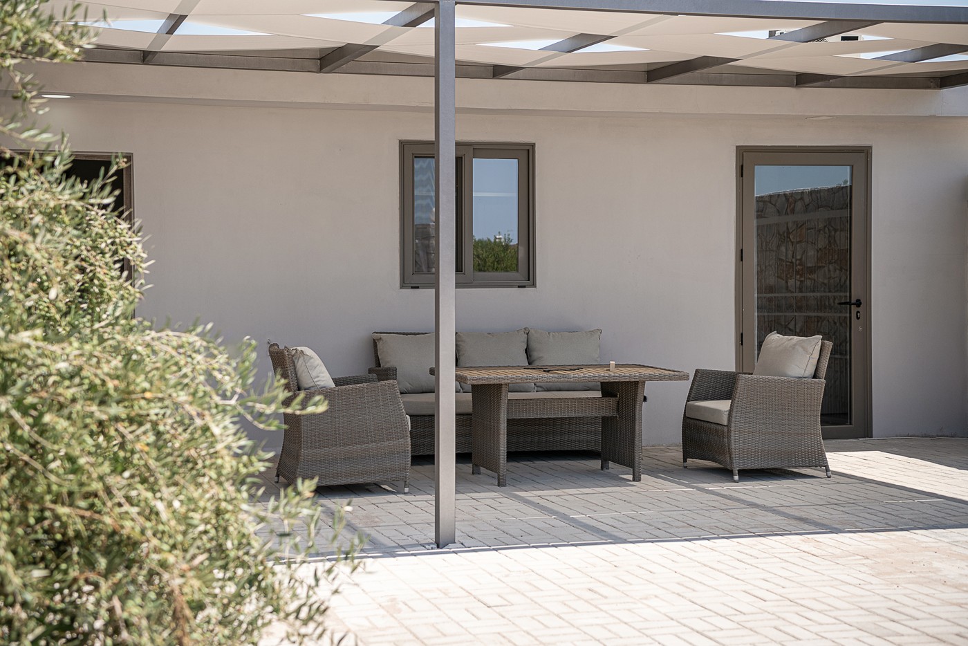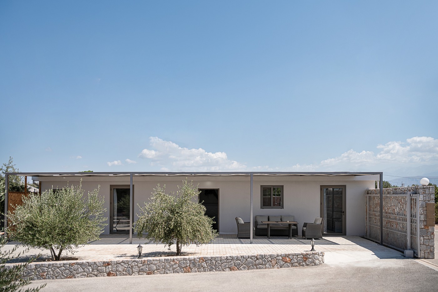 The Alkistis Modern Detached Home with shared pool is a beautiful 2 bedroom holiday home in minimal boho style, with modern touches. On the inside there is a spacious master bedroom with a king size bed and a second bedroom with 2 single ones. The kitchen is well equipped with all the necessary facilities for a comfortable stay.