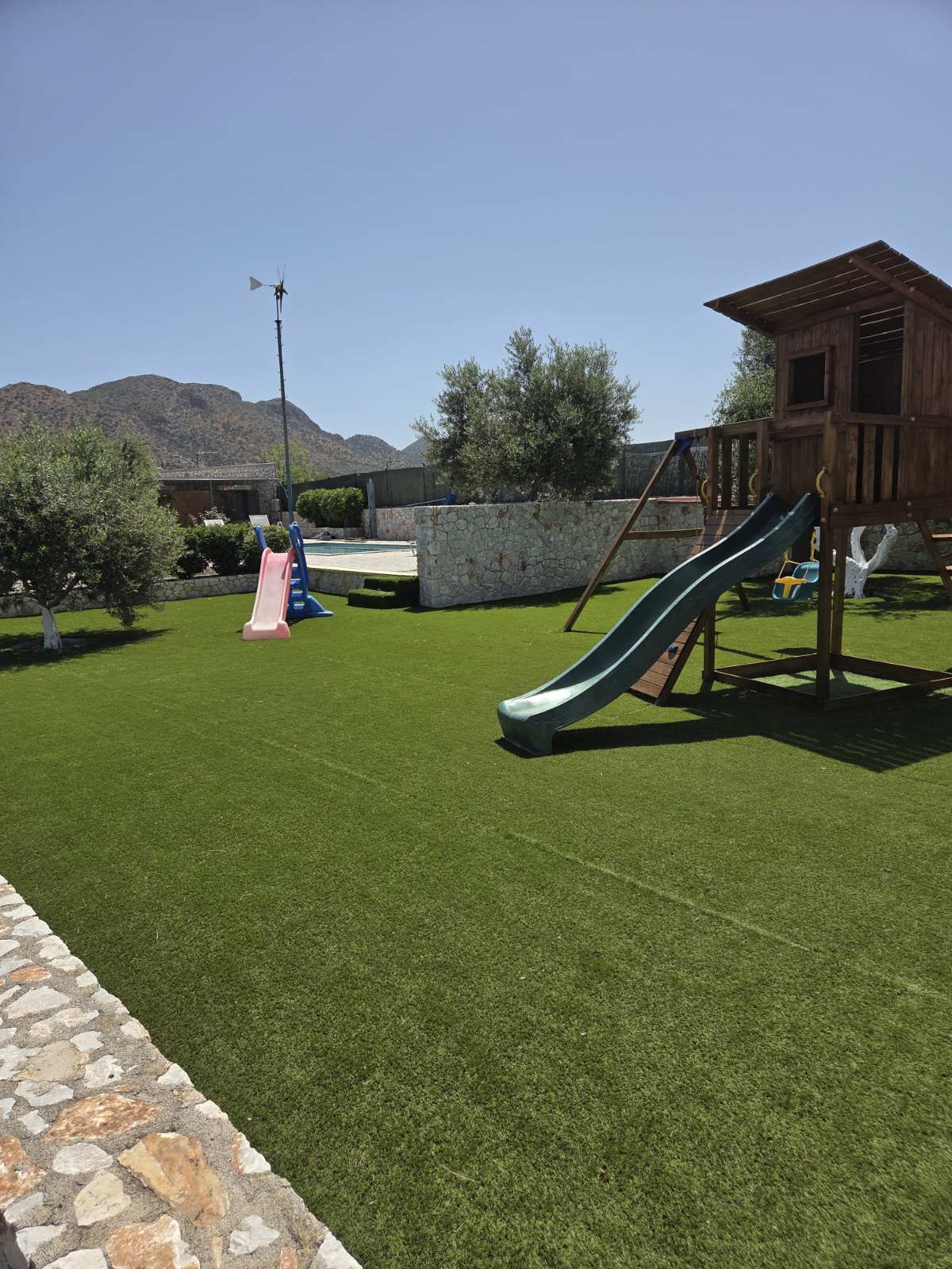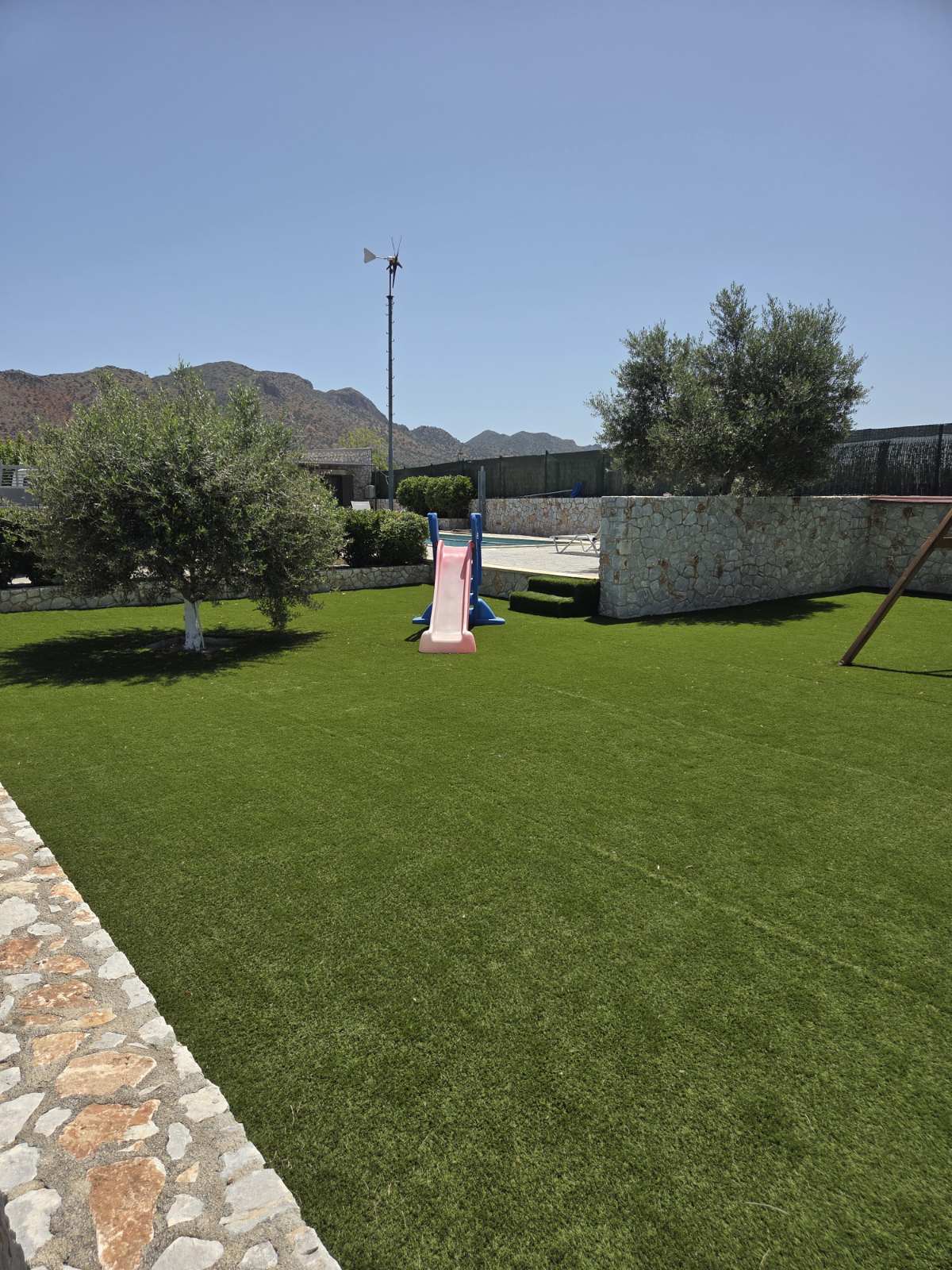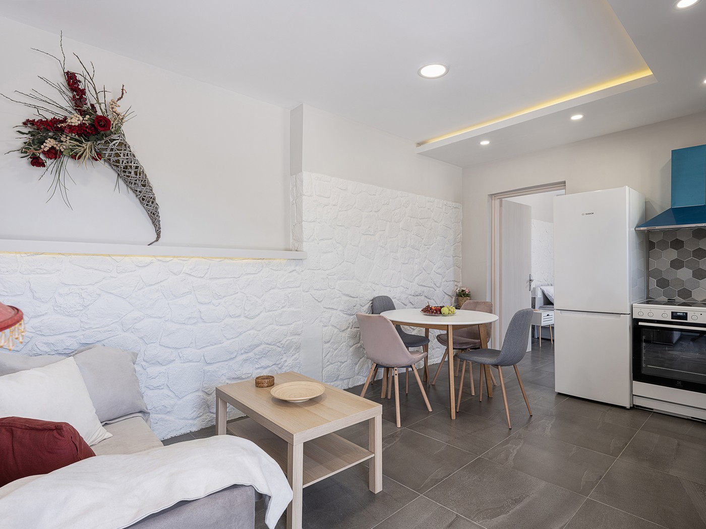 The Alkistis Modern Detached Home with shared pool is a beautiful 2 bedroom holiday home in minimal boho style, with modern touches. On the inside there is a spacious master bedroom with a king size bed and a second bedroom with 2 single ones. The kitchen is well equipped with all the necessary facilities for a comfortable stay.